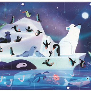 Mit néz a jegesmedve? Kit rejtett a hátán? Ki repül az sarkvidéki égbolton? Lágy színekkel ábrázolt illusztrációk a jég állatok államainak témájáról. Tartalmaz 20 darab óriás puzzlet merev kartonból, 8 darab meglepetéssel! 5 húzófülel, a nagyításhoz, és 3 nyitható ablakot, hogy az illusztrációkban rejtett meglepetések teljessé váljanak.