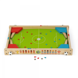 Most szervezhetsz focimeccseket barátaiddal vagy családtaggal, és nyerd meg a tornát! A labda eldobásához egyszerűen nyomja meg a focilabdához hasonló gombokat, mint egy igazi flipperen. Tartalmaz: 10 fa gyalogot (játékosonként 5) és 3 fémgolyót. Formátuma lehetővé teszi, hogy a földön játsszon, akárcsak egy asztalon. A játék kiváló szórakozást ad mindenkinek. Mérete: 54 cm x 39 cm x 6,5 cm