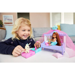 Chelsea a fantázia birodalmába kalauzolja két kis barátját, akiknek kedves meséket olvas, baldachinos heverőjén ülve. A heverő két fiókja egy-egy kis fekhelyet rejt, melyen a kiskutya és a nyuszi békésen alhatnak, ha a mese véget ért. Jó játékot ! A szett tartalmazza a babát, az állatokat, a heverőt és egyéb kiegészítőket.