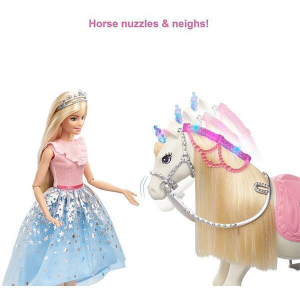 A Barbie Princess Adventure inspirálta önálló, különleges játéksorozatban Barbie babára és lovacskájára varázslatos kalandok várnak egyenesen a Barbie Dreamhouse Adventures sorozat világából érintésre aktiválódó fényekkel, hangokkal, dalokkal és valósághű mozgással. Ha megnyomod a ló homlokát, fejet hajt, nyerít vagy táncra perdül a Dreamhouse Adventures Barbie dalaira. Barbie ebben a készletben sportosan elegáns külsővel érkezik és térdénél hajlik a lába, így könnyedén felültetheted a pink nyeregbe és beakaszthatod a lábát a kengyelbe, hogy elindulhass hercegnői kalandok felé. Jó játékot !