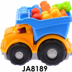 Bébi autó, billencs, dömper, figurával, építőkockákkal, 2 szín, 23 cm, hálóban