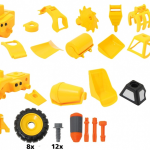 Főbb jellemzők:- 9 különböző modell, 2 alvázzal- Szerszám fogantyúval (a csavarok meghúzása nélkül)- Robosztus műanyag a hosszú játék szórakozásához- Könnyen összeszerelhető erő használata nélkül- Könnyű szétszerelni és összeszerelni- Elősegíti a finom motoros készségeket és a kreativitást A doboz tartalma:- 46 darabos építőipari jármű készlet Műszaki adatok:Méretek: 160-240 x 80-85 x 110-115 mmSúly: 127-136 g Biztonsági előírások- FIGYELMEZTETÉS – Felnőtt közvetlen felügyelete alatt kell használni a kisebb alkatrészek lenyelésének elkerülése érdekében.