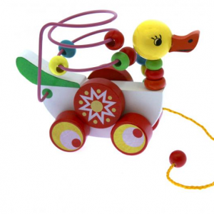 Fa húzós kacsa, hátán drótos ügyességi játék, 17×14 cm dobozban