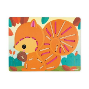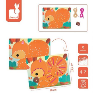 A fűzős ügyességi játék 6 táblából áll – kartonból készült képekből, amelyek ábrázolják: mókust, baglyot, halat, pillanót, csiát és a teknőst. Ezekben a táblákban sok lyuk van, amelyeken keresztül a rájuk rögzített húrokkal bemenetezni, díszítve a képet, és egy kiegészítő elem, például földimogyoró vagy virág, amelyeket mindegyikhez a megfelelő helyen kell rögzíteni. A húrok összekapcsolásával a gyermek fejleszti a motoros koordinációt és a motoros képességeket, megtanulja a színeket és megtanulja a logikus gondolkodást. A táblák biztosítják a hosszú órákig tartó szórakozást, és a kész képek a gyerekszoba dekorációs elemévé válhatnak, vagy még kreatívabb módon felhasználhatók.
