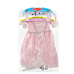 A szett tartalma: szaténból és tüllből készült ruha, ezüst színű korona és pálca.