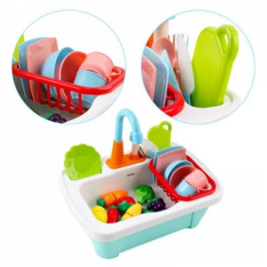 Vissza a termékekhezHa gyermeked érdeklődik a különböző házimunkák iránt, jó választás lehet egy ilyen jól felszerelt mosogató készlet. A szettben egy két részes mosogató található, melynek egyik felében mosogatni lehet, a kosárban pedig az edényeket lehet szárítani. A még élethűbb élmény érdekében játék gyümölcsökkel és zöldségekkel, játék késsel, játék vágódeszkával és játék tányérokkal érhető el. A gyümölcsökön és zöldségeken tépőzár található, így a kicsik félbe vághatják ezeket.