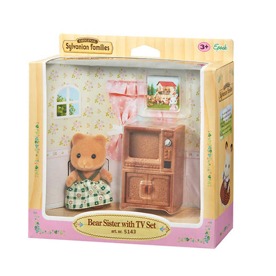 A Sylvanian Families Mackó nővér tv szettel csomag egy mackó lány állatfigurát és egy Sylvanian Families házba illő játék tv-t tartalmaz. Vajon melyik a kedvenc sorozata a mackó lánynak? Játsszd el vele, ahogy hétvégén este a tv előtt pihen, vagy épp egy zenés műsorra táncra perdül. Jó játékot !