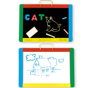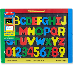 Mágnestábla Melissa & Doug. Kétoldalas tábla, mindkét oldala mágneses. Bárhová magaddal viheted, fogójának köszönhetően kényelmes hordozni. A csomagban 3 db színes krétát, 1 szivacsot, és 36 db mágneses számot és betűt találsz. Méretei: 30 x 40 x 2 cm.