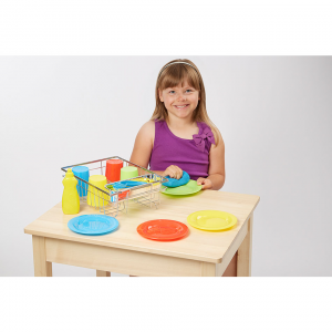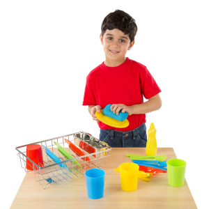 Ebben a mosogató szettben a következő kiegészítőket találod: 4 műanyag tálca, 4 műanyag pohár, 4 műanyag villa, kanál, kés, összenyomható mosogatószertartó, hálóval borított szivacs, illetve egy fém szárító. A játék során fejlődik a szociális kompetencia, illetve a kommunikációs készségek.