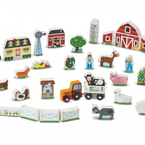 Építsd fel kockáról kockára ezzel a készlettel saját álomvilágodat. A 33 darabos farm témájú készlet, állatokat, épületeket, pótkocsis traktort tartalmaz, amibe pont bele tudod illeszteni és szállítani a farm állatait. A fából készült kis játékelemek csodásan és részletgazdagon díszítettek az egyik oldalukon. Az elemek alkalmasak csoportosításra, számolásra, de még egymásra is pakolhatod őket ezzel is javítva a finom motoros készséget, a számolási ismereteket, a történet elbeszélési képességet és a képzelőerőt. A játékot legizgalmasabban a Mellissa & Doug játékszőnyegén lehet játszani. Méretei: 43 x 37 x 5,6cm. Súlya: 2,4kg