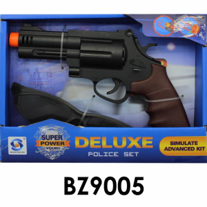 Pisztoly, elemes(gombelem benne), hangot ad és világít, szemüveggel, 19×14 cm dobozban