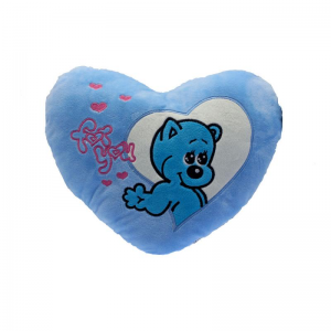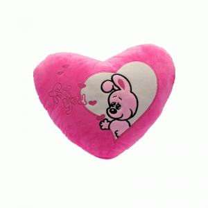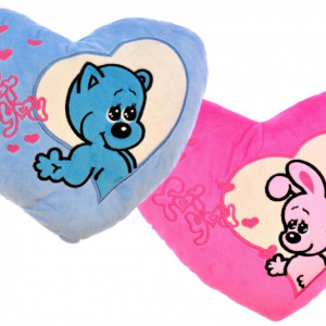Plüss párna, szív alakú, hímzett, rózsaszín nyuszi vagy kék maci minta, 35×33 cm
