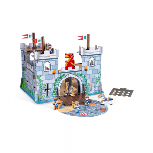 A lovagi kastély gyermeke lenyűgöző történeteket fog kitalálni ezzel az elkészítendő várral és számos kiegészítőjével. Felépítheti a kastélyt (merev kartonból) egy felnőtt segítségével, majd órákig játszhat! Ez a játék tartalmaz: egy nagy várat, 3 toronnyal, felvonóhíddal a kapujával, egy börtönt a sárkány bezárására, egy nagy lépcsőt az első emeletre való bejutáshoz a támadók taszítására és 8 fa figurát (5 lovag, 2 ló és egy sárkány). Jó játékot !