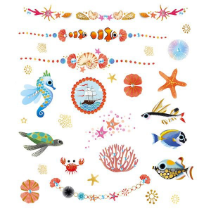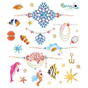 Gyerekeknek tetoválás 3 táblát tartalmaz a témája a sellők és a világuk. Tetoválások aranyszínű gondolatokkal a bőrére. Hal, kagyló, korall … Ajándéknak is kiváló barátnődnek.