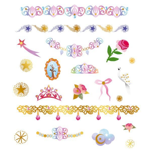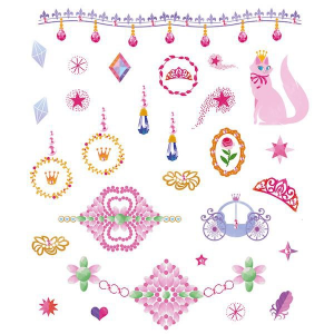 Gyerekeknek tetoválás 3 táblát tartalmaz  a témája a hercegnők és a világuk. Tetoválások aranyszínű gondolatokkal a bőrére. Virágok, gyémántok, korona … Ajándéknak is kiváló barátnődnek.