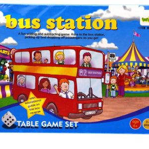 Buszos utasgyűjtő társasjáték, mindenki a maga buszára gyűjti az utasokat a kockákon dobott értékek szerint, fel vagy leszállnak az utasok, a legtöbb utast szállító busz nyer, 28×21 cm dobozban