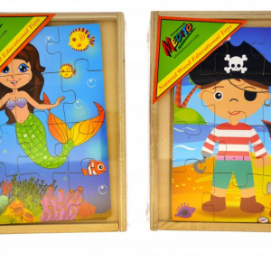 Fa puzzle, 4 kép az 1-ben, 12 darabos, 2-féle: sellős, kalózos, 15×20 cm fa dobozban