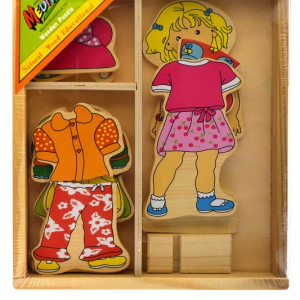 Fa öltöztetős játék, lány, 13 kiegészítővel, 22×20 cm fadobozban