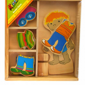 Fa öltöztetős játék, fiú, 13 kiegészítővel, 22×20 cm fadobozban